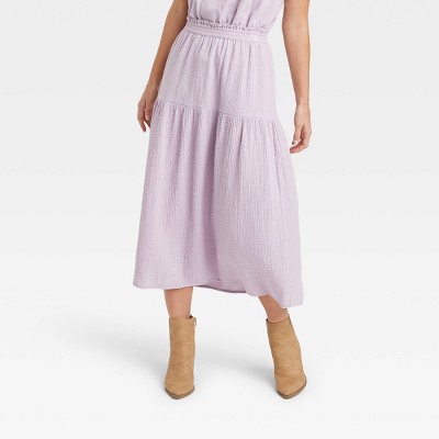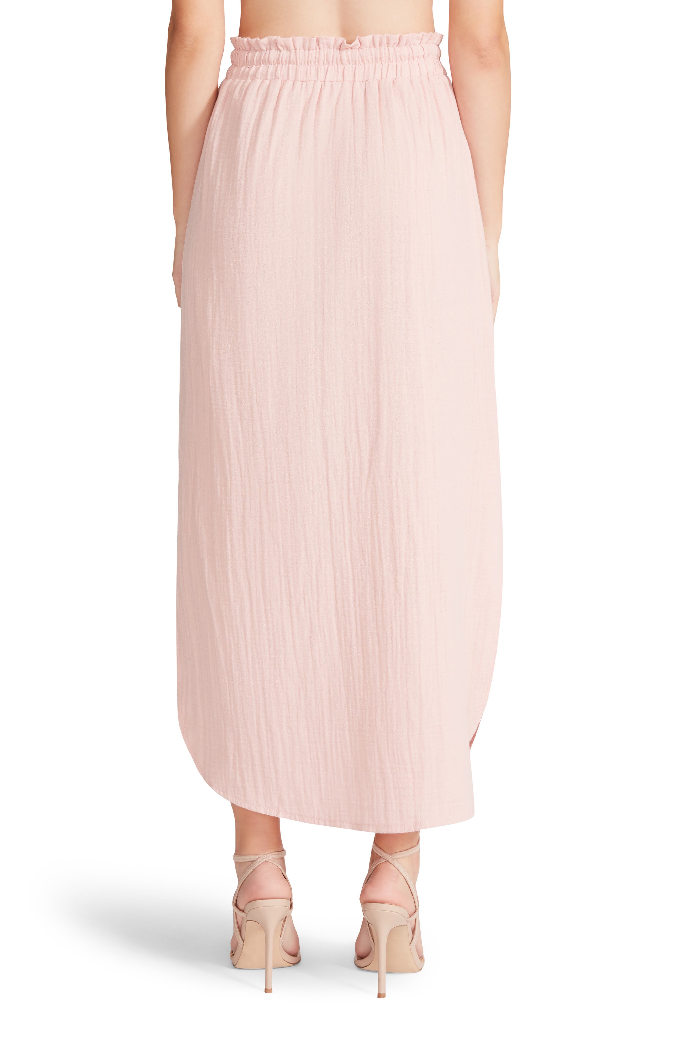 12 198. SKIRT DUSTY PINK GAUZE. Elasticized waistband has a braided drawstring with bells on the ends.